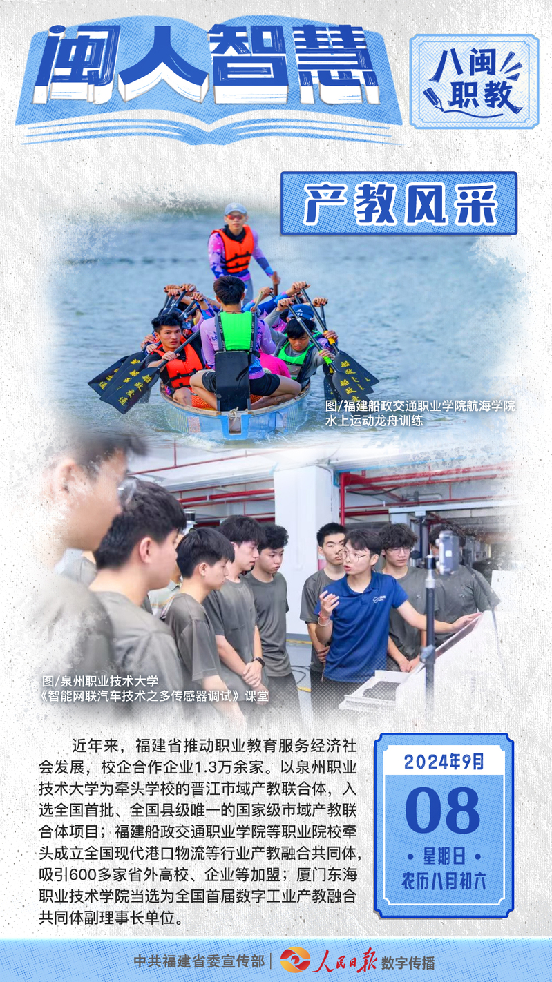 近期,中共福建省委宣傳部和人民日?qǐng)?bào)數(shù)字傳播共同出品的《閩人智慧》日簽欄目特別策劃推出八閩職教系列,圍繞院校風(fēng)采、產(chǎn)教風(fēng)采、學(xué)生風(fēng)采、服務(wù)風(fēng)采、創(chuàng)業(yè)風(fēng)采、工匠風(fēng)采等主題展現(xiàn)福建如何賡續(xù)優(yōu)良傳統(tǒng),培養(yǎng)高素質(zhì)技術(shù)技能人才,讓職業(yè)教育成果在八閩大地落地開(kāi)花。