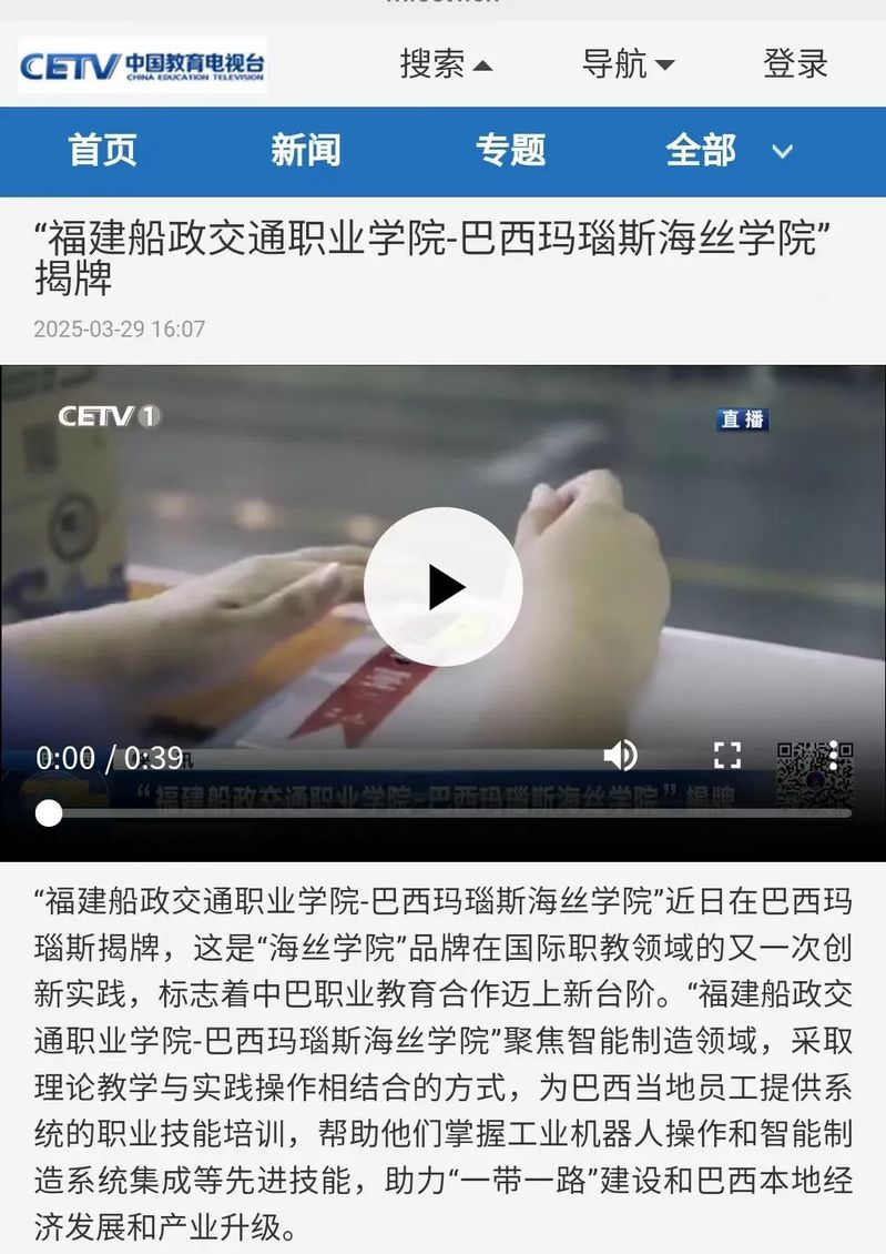 3月29日,中國教育電視臺報道我院在巴西設(shè)立“海絲學(xué)院”,標志著中巴職業(yè)教育合作邁上新臺階。正文如下: