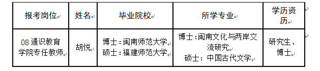 按照《關(guān)于印發(fā)<福建省省屬事業(yè)單位公開招聘工作人員考試暫行辦法>的通知》(閩人發(fā)〔2006〕11號(hào))和《2024年福建船政交通職業(yè)學(xué)院專項(xiàng)公開招聘總量控制高層次人才方案(二)》等文件要求,經(jīng)報(bào)名、資格審查、面試、考察、體檢等有關(guān)程序,經(jīng)學(xué)校黨委會(huì)議研究,確定胡悅為08通識(shí)教育學(xué)院專任教師擬聘用人員,現(xiàn)予以公示。