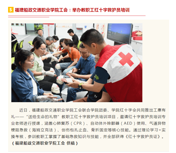 4月29日,我院工會聯(lián)合學(xué)院團(tuán)委、學(xué)院紅十字會共同推出的工惠有禮——“送給生命的禮物”首期教職工紅十字救護(hù)員培訓(xùn)活動圓滿結(jié)束。福建省總工會官方微信公眾號對我院活動進(jìn)行報道: