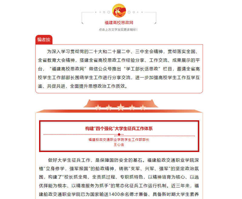 為深入學(xué)習(xí)貫徹黨的二十大和二十屆二中、三中全會(huì)精神,貫徹落實(shí)全國(guó)、全省教育大會(huì)精神,搭建全省高校思政工作經(jīng)驗(yàn)分享、工作交流、成果展示的平臺(tái),“福建高校思政網(wǎng)”微信公眾號(hào)推出“學(xué)工部長(zhǎng)話思政”欄目,邀請(qǐng)全省高校學(xué)生工作部部長(zhǎng)圍繞學(xué)生工作進(jìn)行分享交流,進(jìn)一步加強(qiáng)高校學(xué)生工作互學(xué)互鑒、共促共進(jìn),全面提升思想政治工作質(zhì)效。
