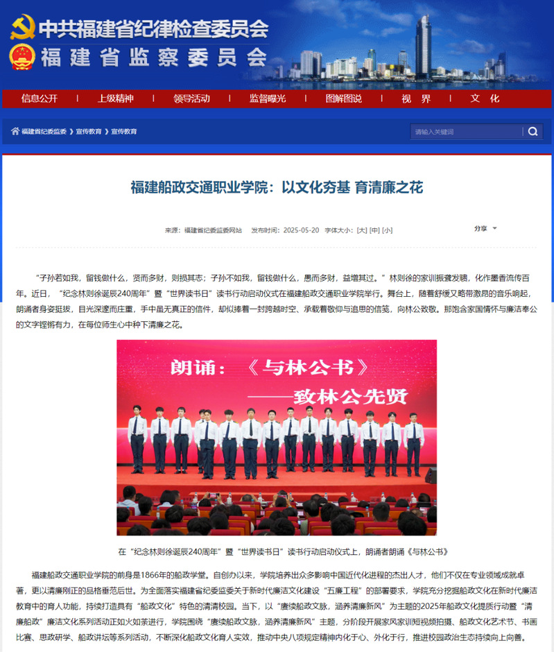 福建船政交通職業(yè)學(xué)院的前身是1866年的船政學(xué)堂。自創(chuàng)辦以來,學(xué)院培養(yǎng)出眾多影響中國近代化進(jìn)程的杰出人才,他們不僅在專業(yè)領(lǐng)域成就卓著,更以清廉剛正的品格垂范后世。為全面落實福建省紀(jì)委監(jiān)委關(guān)于新時代廉潔文化建設(shè)“五廉工程”的部署要求,學(xué)院充分挖掘船政文化在新時代廉潔教育中的育人功能,持續(xù)打造具有“船政文化”特色的清清校園。當(dāng)下,以“賡續(xù)船政文脈,涵養(yǎng)清廉新風(fēng)”為主題的2025年船政文化提質(zhì)行動暨“清廉船政”廉潔文化系列活動正如火如荼進(jìn)行,學(xué)院圍繞“賡續(xù)船政文脈,涵養(yǎng)清廉新風(fēng)”主題,分階段開展家風(fēng)家訓(xùn)短視頻拍攝、船政文化藝術(shù)節(jié)、書畫比賽、思政研學(xué)、船政講壇等系列活動,不斷深化船政文化育人實效,推動中央八項規(guī)定精神內(nèi)化于心、外化于行,推進(jìn)校園政治生態(tài)持續(xù)向上向善。