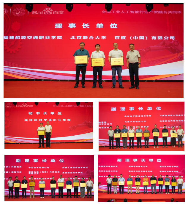 大會現場舉行了理事長單位、副理事長單位、常務理事單位及理事單位授牌儀式,百度(中國)有限公司、北京聯合大學、福建船政交通職業(yè)學院榮膺理事長單位,福建船政交通職業(yè)學院當選秘書長單位,并順利通過了《全國工業(yè)人工智能行業(yè)產教融合共同體章程》。