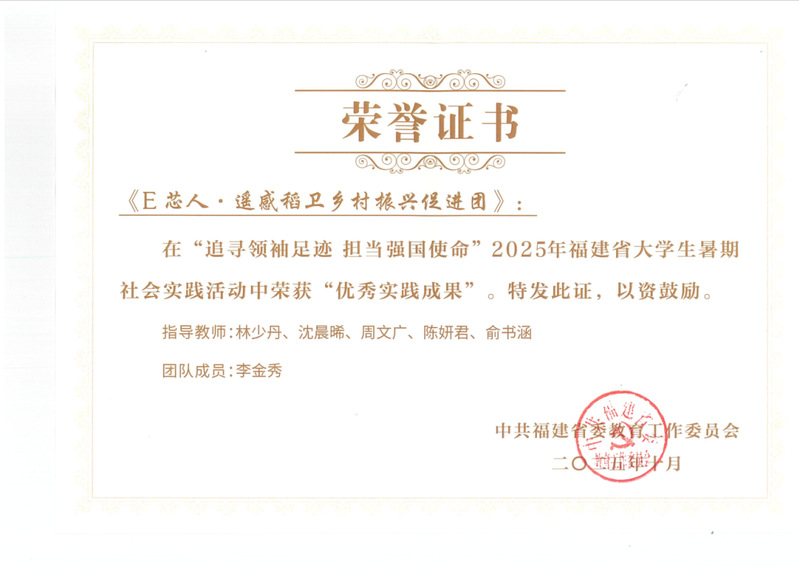 近日,中共福建省委教育工委組織的“追尋領(lǐng)袖足跡 擔(dān)當強國使命”2025年福建省大學(xué)生暑期社會實踐成果遴選結(jié)果已公布?;顒泳劢菇逃?、科技、人才“三位一體”協(xié)同融合發(fā)展主題,吸引全省各高校積極參與。經(jīng)過嚴格的材料審核與專家評審,我院信息與智慧交通學(xué)院“E 芯人?遙感稻衛(wèi)鄉(xiāng)村振興促進團”申報的實踐成果脫穎而出,榮獲省級“優(yōu)秀實踐成果”獎。