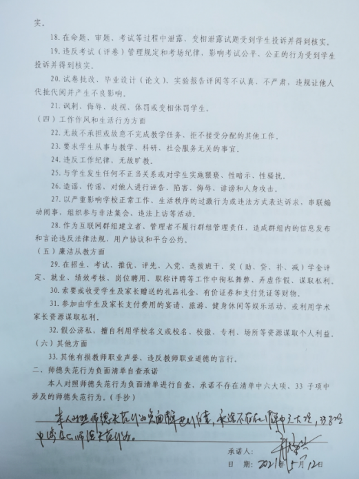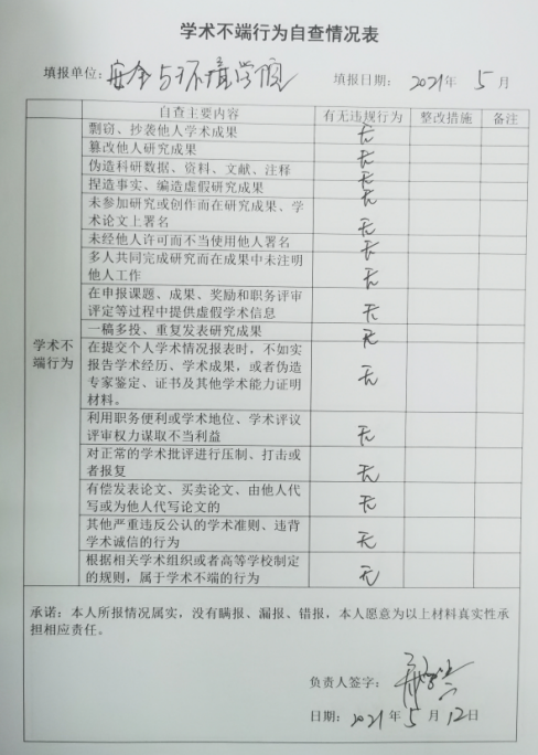 2、開(kāi)展師風(fēng)師德自查。逐個(gè)教師、逐個(gè)教研室進(jìn)行徹底排查,落實(shí)每個(gè)教職工在思想政治紀(jì)律、學(xué)術(shù)道德、教育教學(xué)、工作作風(fēng)、生活行為、廉潔從教及其他等諸方面是否存在師德失范行為。全體教職工公開(kāi)表態(tài)承諾,并簽訂《安全與環(huán)境學(xué)院教師師德失范行為負(fù)面清單自查承諾書(shū)》和《學(xué)術(shù)不端行為自查情況表》。