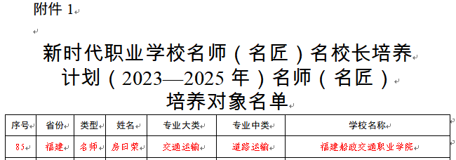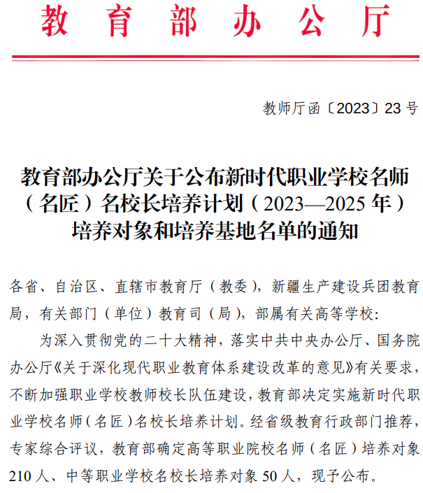 近日,教育部辦公廳下發(fā)《關(guān)于公布新時代職業(yè)學校名師(名匠)名校長培養(yǎng)計劃(2023—2025年)培養(yǎng)對象和培養(yǎng)基地名單的通知》,確定高等職業(yè)院校名師(名匠)培養(yǎng)對象210人、中等職業(yè)學校名校長培養(yǎng)對象50人。我院房曰榮教授入選為高等職業(yè)院校名師培養(yǎng)對象。