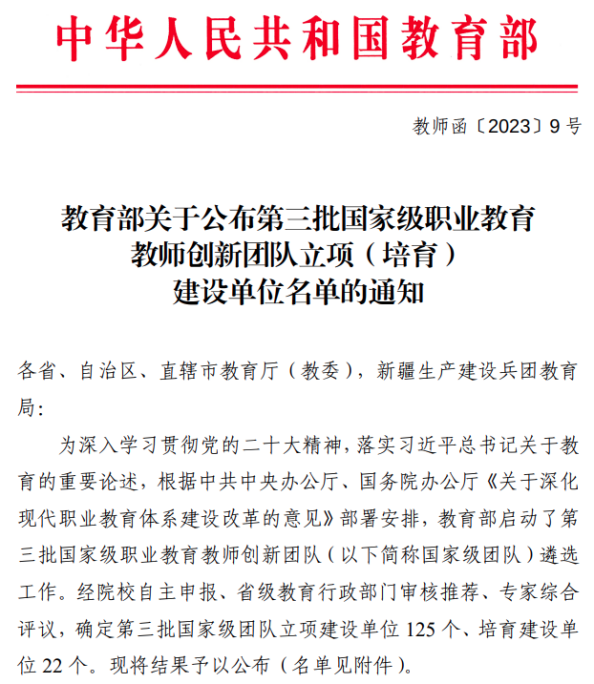 近日,教育部印發(fā)《關于公布第三批國家級職業(yè)教育教師創(chuàng)新團隊立項(培育)建設單位名單的通知》,我院被確定為第三批國家級職業(yè)教育教師創(chuàng)新團隊立項(培育)建設單位。