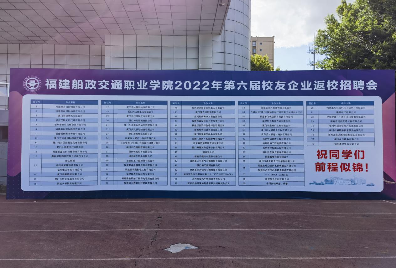 為認真貫徹落實習近平總書記關(guān)于高校畢業(yè)生就業(yè)的重要指示精神和中央關(guān)于高校畢業(yè)生就業(yè)工作的決策部署,學院于9月3日下午16:00在南區(qū)田徑場成功舉辦2022年第六屆校友企業(yè)返校招聘會,此次招聘會由福建船政交通職業(yè)學院主辦,福建船政交通職業(yè)學院校友會及福建省船政文化交流協(xié)會承辦,共有78家省內(nèi)知名企業(yè)來校參會。
