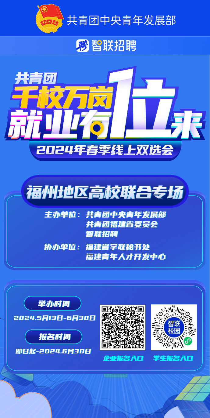為深入貫徹團(tuán)中央促進(jìn)大學(xué)生就業(yè)行動,切實(shí)為畢業(yè)生提供就業(yè)崗位信息、暢通求職渠道、為用人單位和畢業(yè)生搭建供需橋梁,幫助促進(jìn)高校畢業(yè)生更加充分更高質(zhì)量就業(yè)?,F(xiàn)舉辦“千校萬崗 就業(yè)有位來”2024年福州地區(qū)高校畢業(yè)生春季聯(lián)合專場線上招聘會,重點(diǎn)面向福州、莆田2024屆及往屆未就業(yè)所有高校畢業(yè)生,誠邀各用人單位及畢業(yè)生報(bào)名參會。現(xiàn)將有關(guān)事項(xiàng)函告如下: